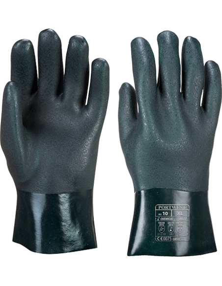 Guante químico de PVC de calidad Premium. Excelente dexteridad con un agarre seguro por el acabado arenoso sobre la palma. El soporte sin costuras asegura comodidad y flexibilidad.
