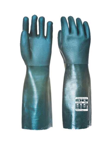 Guante de PVC de doble baño con acabado arenoso sobre la palma para un mayor agarre. Forro tricotado para mayor comodidad. Disponible en 3 longitudes 27cm 35cm y 45cm.