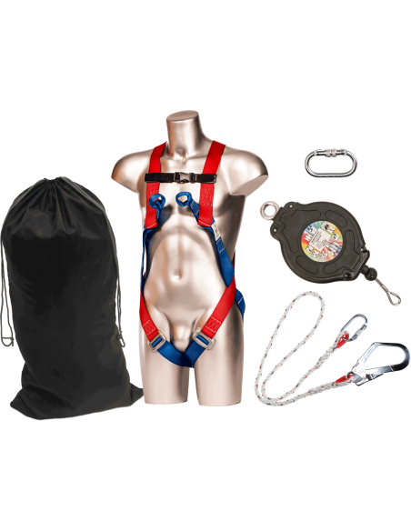- Arnés de 2 puntos- Dispositivo anticaídas con cable- Línea sencilla con mosquetón y conector automático- Mosquetón- Bolsa de Nylon con cordón